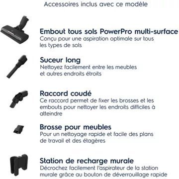 - Station de charge à poser : Pour recharger et ranger l’appareil et ses accessoires (évite de devoir percer les murs)