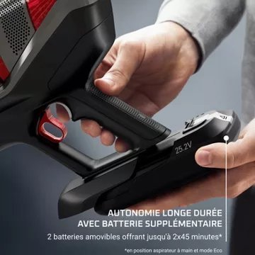 - Aspirateur à main : Directement intégré au corps de l’aspirateur balai. Se détache facilement pour une utilisation d’appoint (ex: table, voiture, fauteuil)