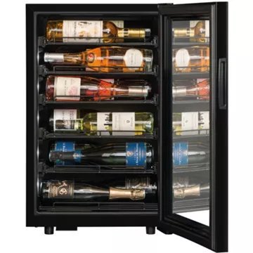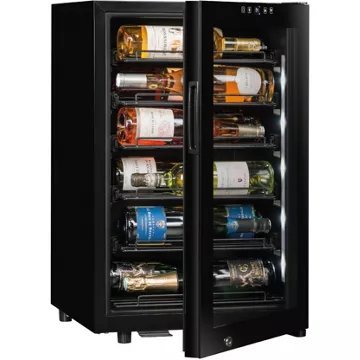 - Type de porte : vitrée, permet de visualiser facilement les bouteilles sans avoir à ouvrir la porte, ce qui réduit la circulation de l’air dans la cave et donc la variation de la température. Le traitement anti-uv protège le contenu.