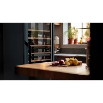 - Type de porte : vitrée, permet de visualiser facilement les bouteilles sans avoir à ouvrir la porte, ce qui réduit la circulation de l’air dans la cave et donc la variation de la température. Le traitement anti-uv protège le contenu.