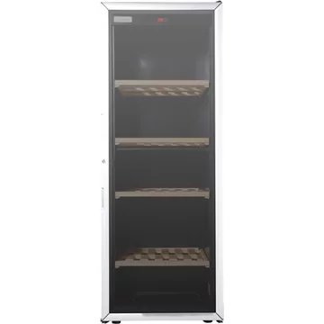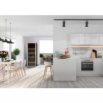- Type de porte : vitrée, permet de visualiser facilement les bouteilles sans avoir à ouvrir la porte, ce qui réduit la circulation de l’air dans la cave et donc la variation de la température. Le traitement anti-uv protège le contenu.