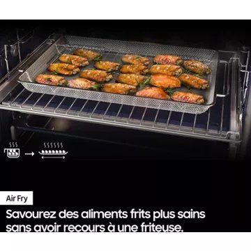 Le nouveau four pyrolyse SAMSUNG NV7B6795JAK Bespoke vous propose plusieurs autres fonctionnalités innovantes. Avec Air Fry, vous pourrez utiliser le panier livré avec le four, ajouter un peu d’huile et faire cuire vos aliments grâce à un système qui enveloppe les aliments avec l’air chaud. Le système Air sous vide, quant à lui, contrôle la température statique du four et dispose de 2 capteurs pour chaque cavité du four ; tous vos plats seront parfaitement cuits dans chacune des cavités.