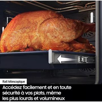 • Rails téléscopiques : ils permettent d’accéder à vos plats en les faisant coulisser en dehors de l’enceinte de cuisson en évitant les risques de basculement. Vous pourrez arroser confortablement votre rôti ou retourner facilement vos plats sans risque de brûlure.