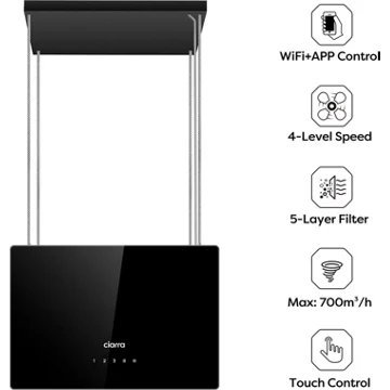 - Arrêt temporisé : oui, permet de programmer une durée de fonctionnement après la cuisson. Une fois cette durée écoulée, la hotte s’éteint automatiquement, offrant ainsi un moyen pratique d’économiser de l’énergie et de prolonger la purification de l’air après la cuisson.