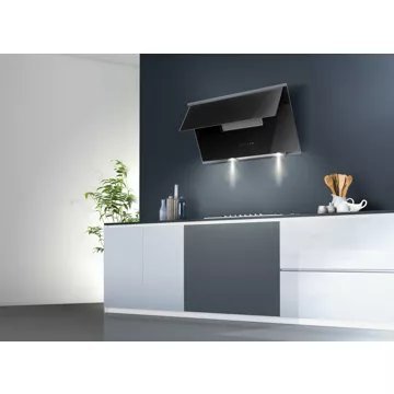 Cette hotte se distingue des autres par son design ultra moderne en verre. Équipée d’une surface d’aspiration en dessous, elle intègre également d’une deuxième surface d’aspiration en façade pour augmenter sa capacité. Cette dernière est cachée par un rabat, la rendant ainsi très discrète lorsqu’il est fermé.