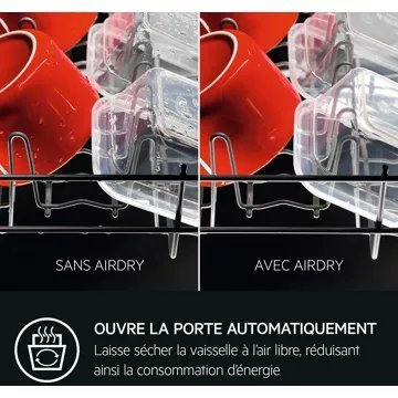 - Avantage de l’ouverture automatique de la porte : Après le cycle de lavage , la porte du lave vaisselle s’ouvre automatiquement pour laisser la vapeur s’échapper. Cela permet à l’air de pénétrer à l’intérieur et de sécher les ustensiles, plats et couverts.