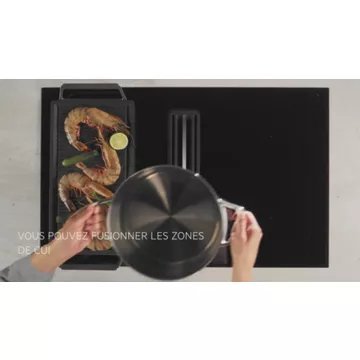 - Interconnexion table/hotte : Oui. Une fois la table de cuisson active, l’éclairage de la hotte compatible s’enclenche et règle la puissance d’aspiration en automatique.