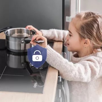 - Sécurités : arrêt automatique, coupure en cas de débordement, anti surchauffe, verrouillage du clavier, témoin de chaleur résiduelle, détection d’absence de récipient, détection de petits objets, témoin de mise sous tension
